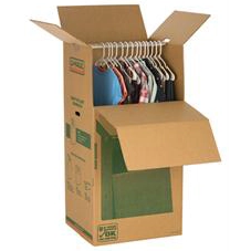 The Grand Wardrobe Box is specially designed for packing clothes on hangers. The box comes with a 24-inch metal hanging bar so you can quickly transfer hanging clothes directly from your closet to the wardrobe box for a wrinkle-free move. One of U-Haul's largest wardrobe moving boxes, the Grand Wardrobe Box holds up to two feet of closet space and easily stores long garments like dresses, suits, and jackets. Not all clothing boxes are created equal – the Grand Wardrobe Box features built-in, perforated handles to make lifting and carrying easier. This wardrobe box can also be used for packing dining room chairs or other tall, bulky items.